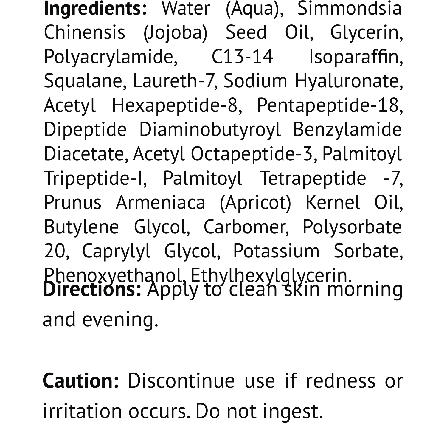Water (Aqua), Simmondsia Chinensis (Jojoba) Seed Oil, Glycerin, Polyacrylamide, C13-14 Isoparaffin, Squalane, Laureth-7, Sodium Hyaluronate, Acetyl Hexapeptide-8, Pentapeptide-18, Dipeptide Diaminobutyroyl Benzylamide Diacetate, Acetyl Octapeptide-3, Palmitoyl Tripeptide-1, Palmitoyl Tetrapeptide -7, Prunus Armeniaca (Apricot) Kernel Oil, Butylene Glycol, Carbomer, Polysorbate 20, Caprylyl Glycol, Potassium Sorbate, Phenoxyethanol, Ethylhexylglycerin.