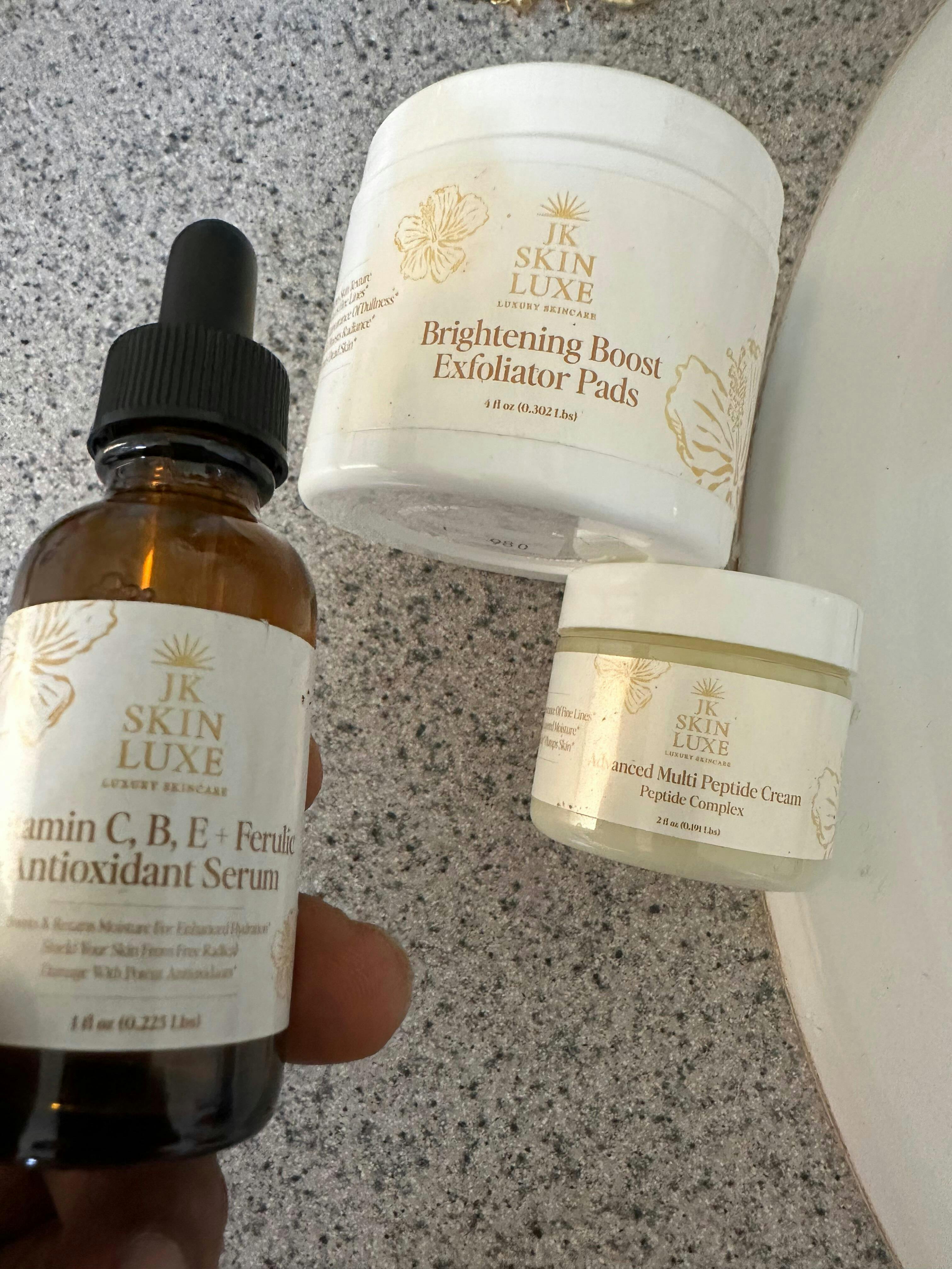 Luxury Skincare Trio Reveal your most radiant skin with our Luxury Skincare Trio — a 3-step premium system crafted to brighten, hydrate, and rejuvenate your skin from within. Each formula works together to deliver a smooth, luminous, and youthful complexion. ✨ What’s Inside: • Advanced Multi Peptide Cream (Peptide Complex): A luxurious anti-aging moisturizer that firms, plumps, and restores skin elasticity while reducing fine lines and wrinkles. • Brightening Boost Exfoliator Pads: Gently exfoliates dead skin cells, refines texture, and reveals a fresh, glowing surface with each use. • Vitamin C, B, E + Ferulic Antioxidant Serum: A powerful brightening serum that defends against environmental damage while improving skin tone and radiance. 💧 Perfect For: All skin types — especially dull, uneven, or tired-looking skin. 🌿 Benefits: • Deep hydration & nourishment • Smooths texture & reduces wrinkles • Boosts glow & brightens complexion • Protects against free radicals 🕊️ How to Use: 1 Start by gently sweeping the Brightening Boost Exfoliator Pads across clean skin. 2 Apply 3–4 drops of the Vitamin C, B, E + Ferulic Antioxidant Serum and let it absorb. 3 Finish with the Advanced Multi Peptide Cream for deep hydration and a silky glow.